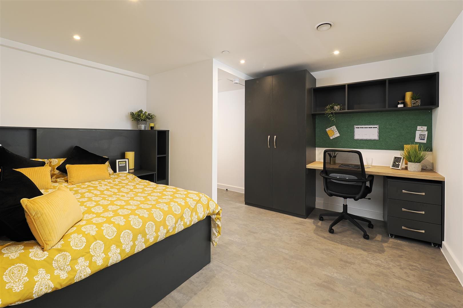 A stylish, one bed studio apartment, fully equipped with a modern kitchen, separate study space, double bed, plenty of storage and your own en-suite shower room.