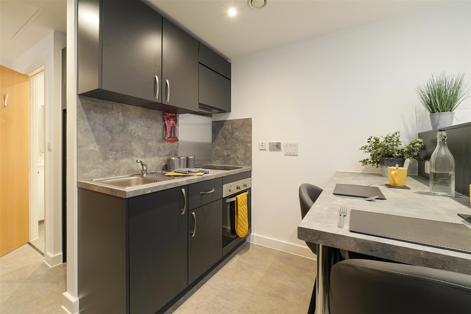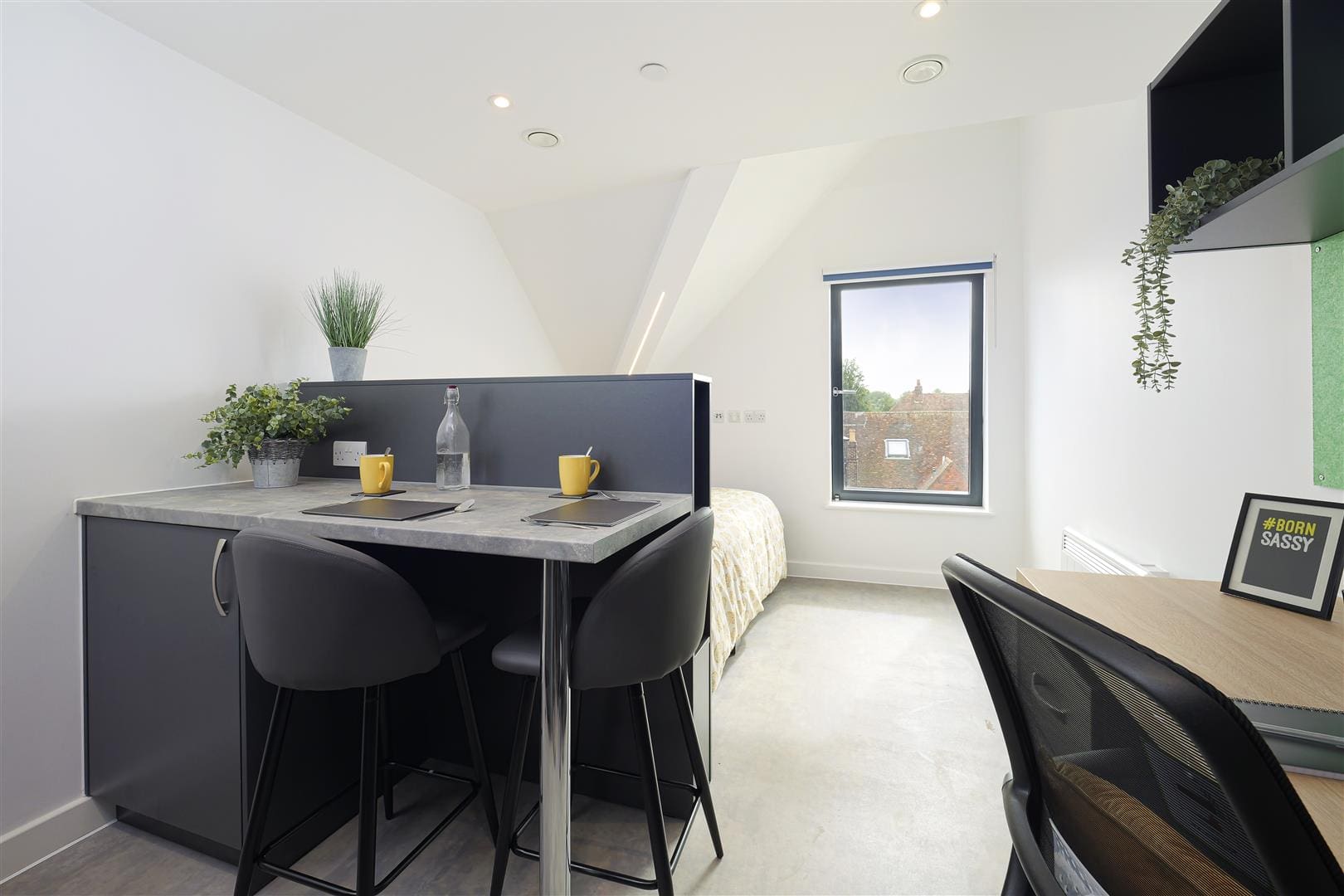 A stylish, one bed studio apartment, fully equipped with a modern kitchen, separate study space, double bed, plenty of storage and your own en-suite shower room.