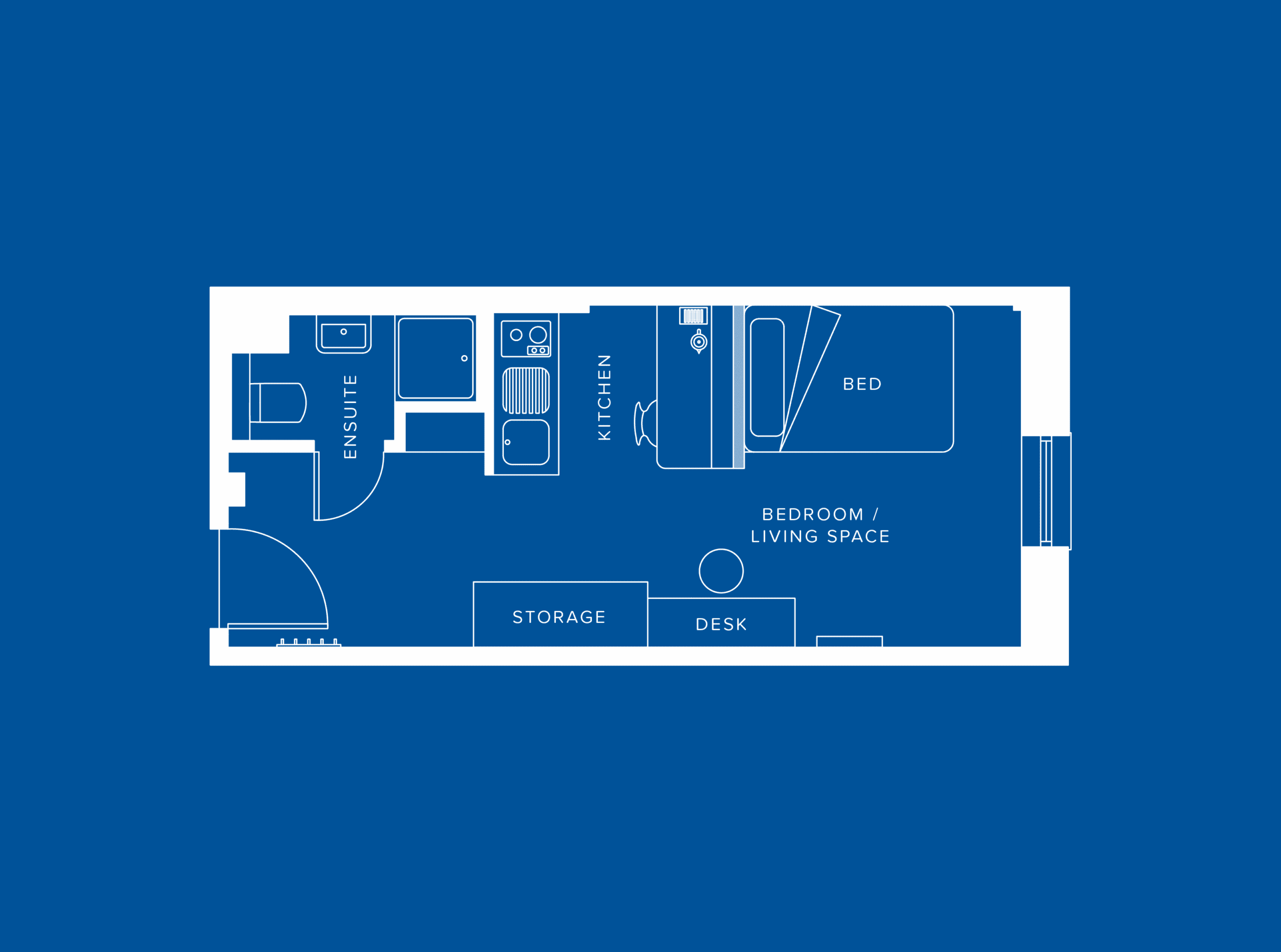 A stylish, one bed studio apartment, fully equipped with a modern kitchen, separate study space, double bed, plenty of storage and your own en-suite shower room.