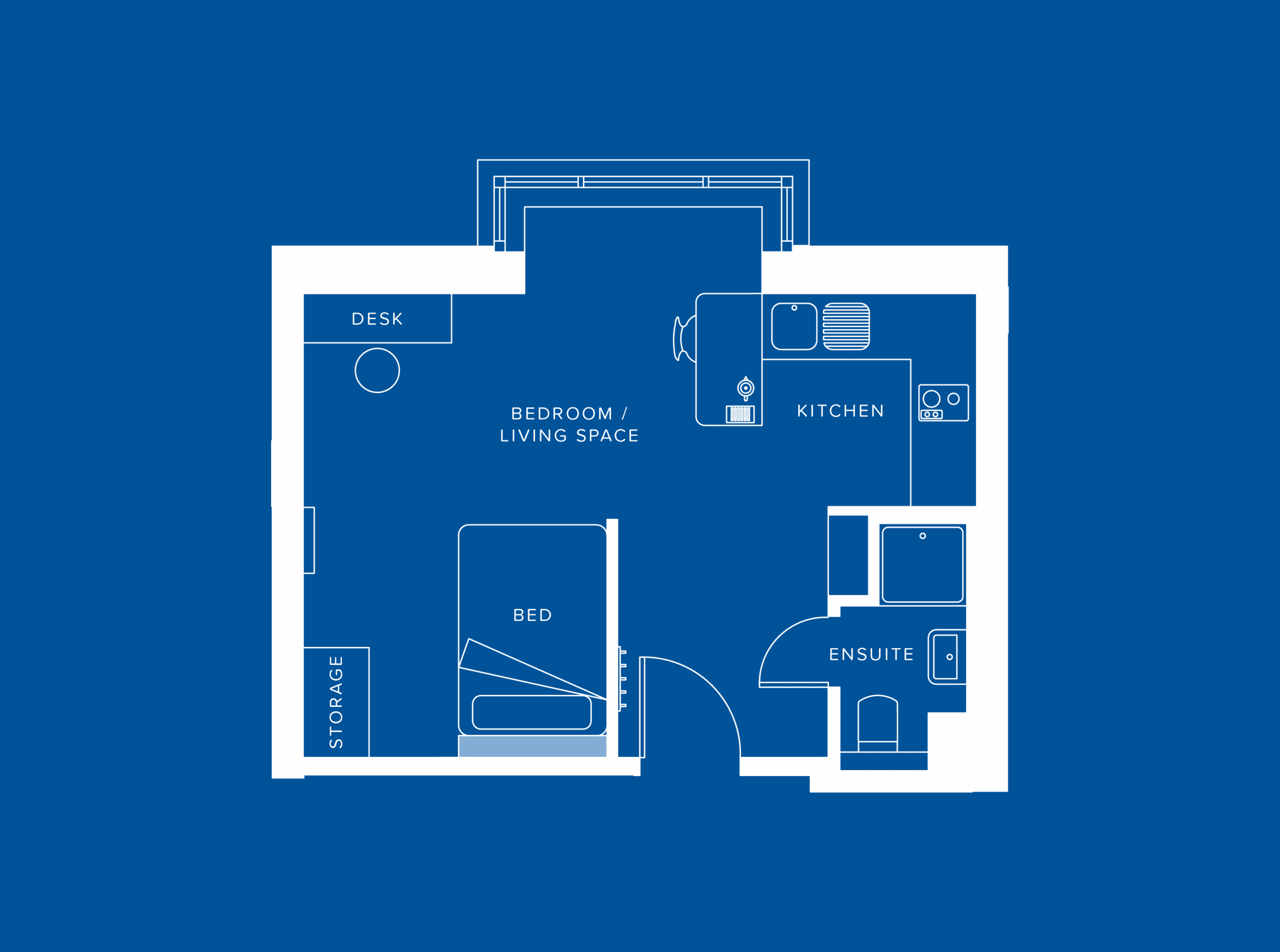 A stylish, one bed studio apartment, fully equipped with a modern kitchen, separate study space, double bed, plenty of storage and your own en-suite shower room.