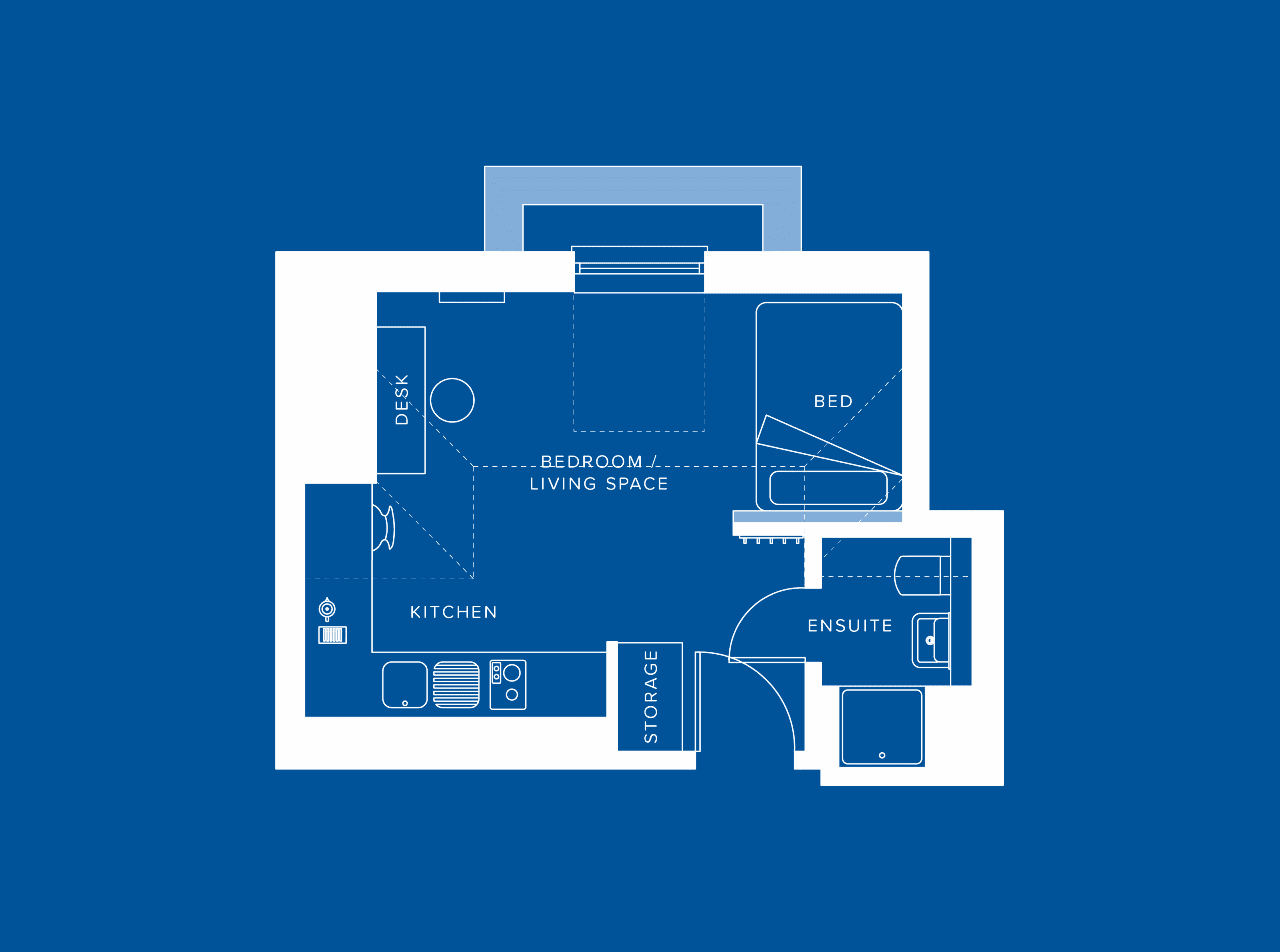 A stylish, one bed studio apartment, fully equipped with a modern kitchen, separate study space, double bed, plenty of storage and your own en-suite shower room.
