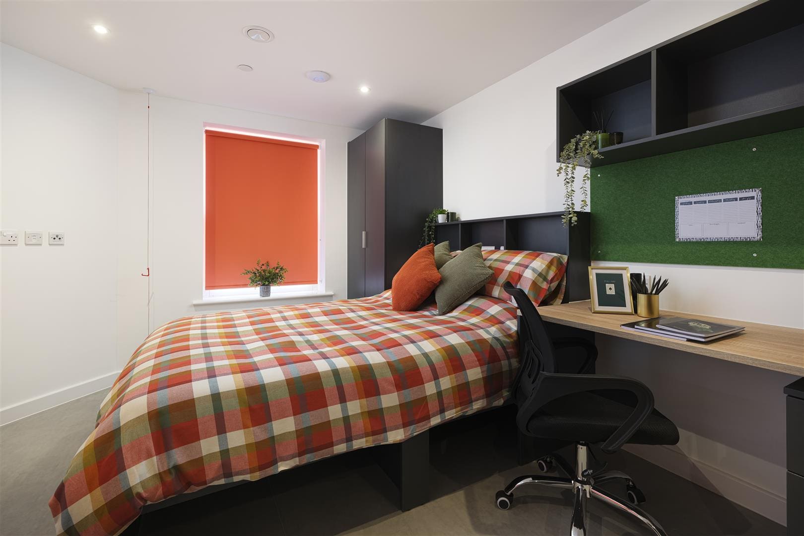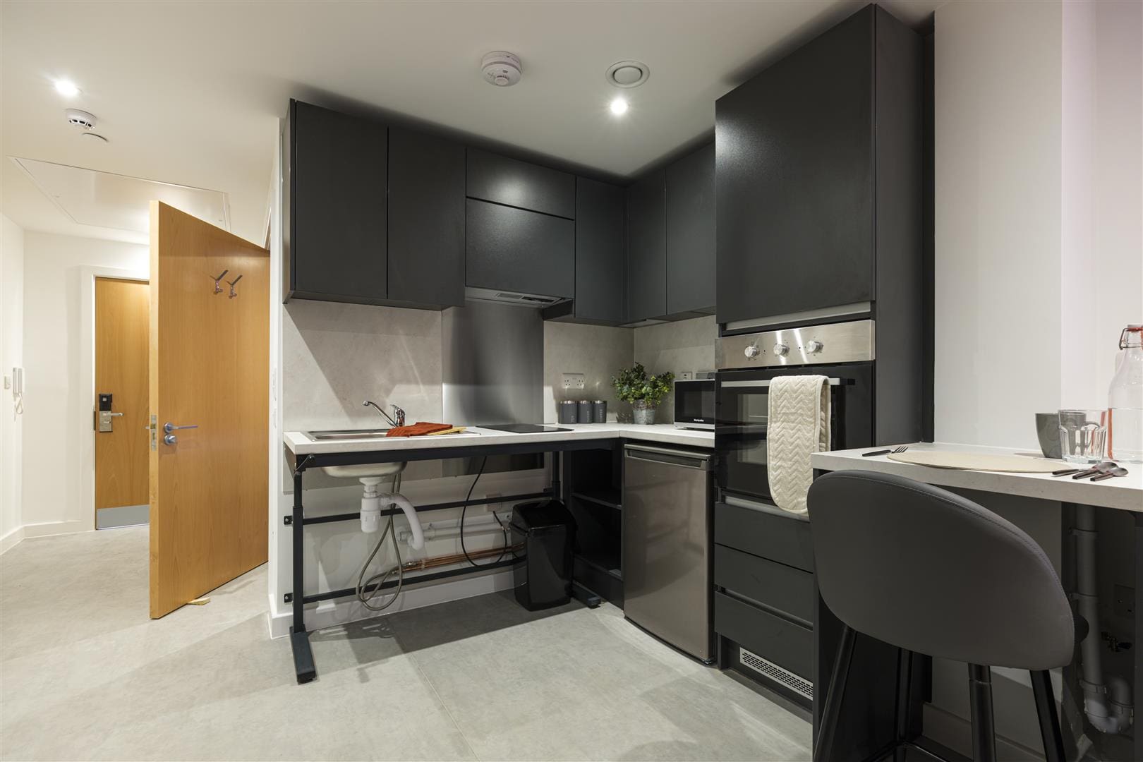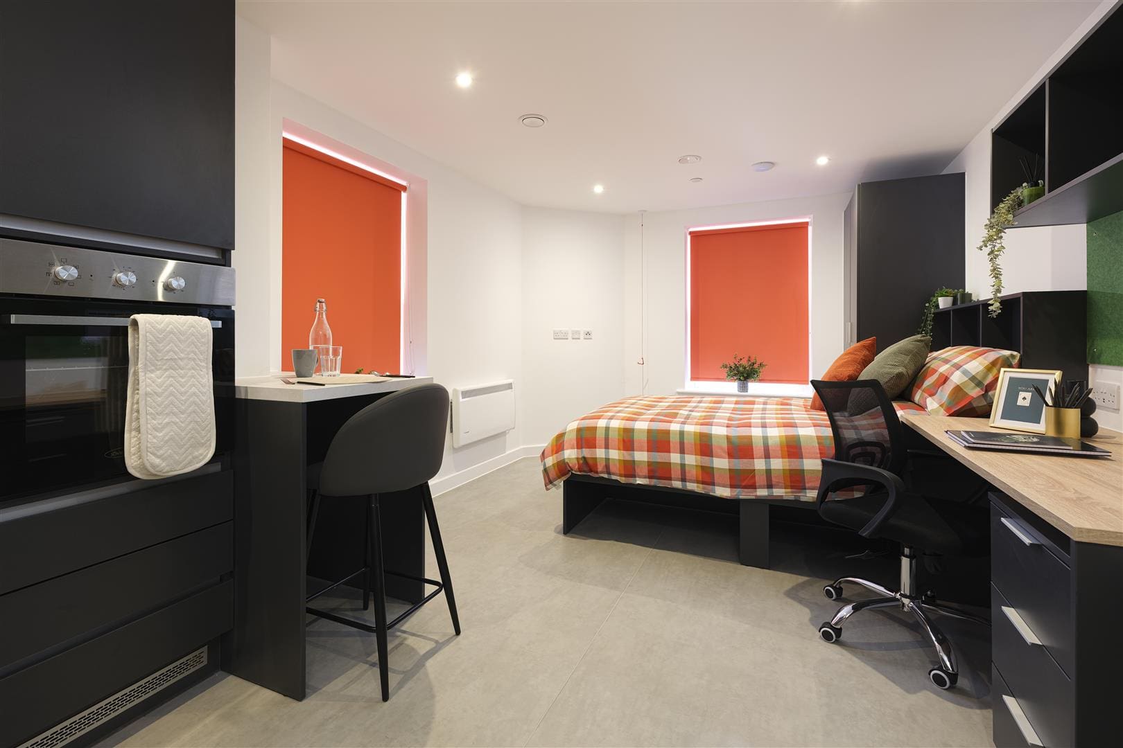 A stylish, one bed studio apartment, fully equipped with a modern kitchen, separate study space, double bed, plenty of storage and your own en-suite shower room.