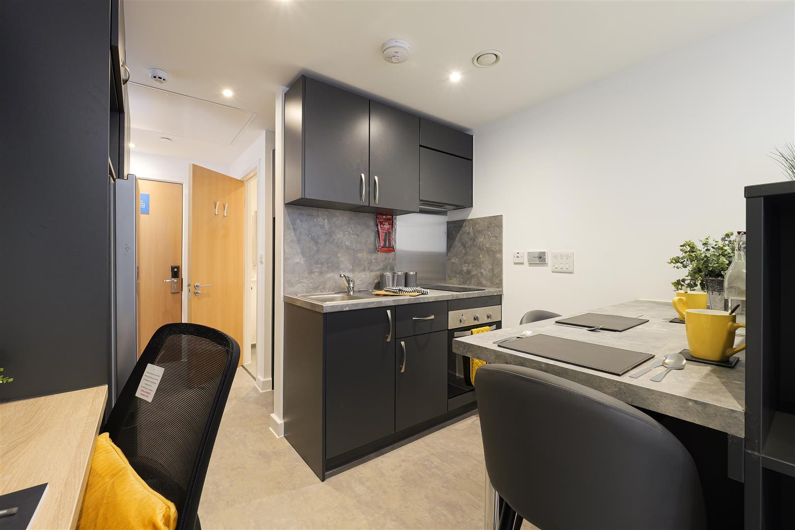 A stylish, one bed studio apartment, fully equipped with a modern kitchen, separate study space, double bed, plenty of storage and your own en-suite shower room.